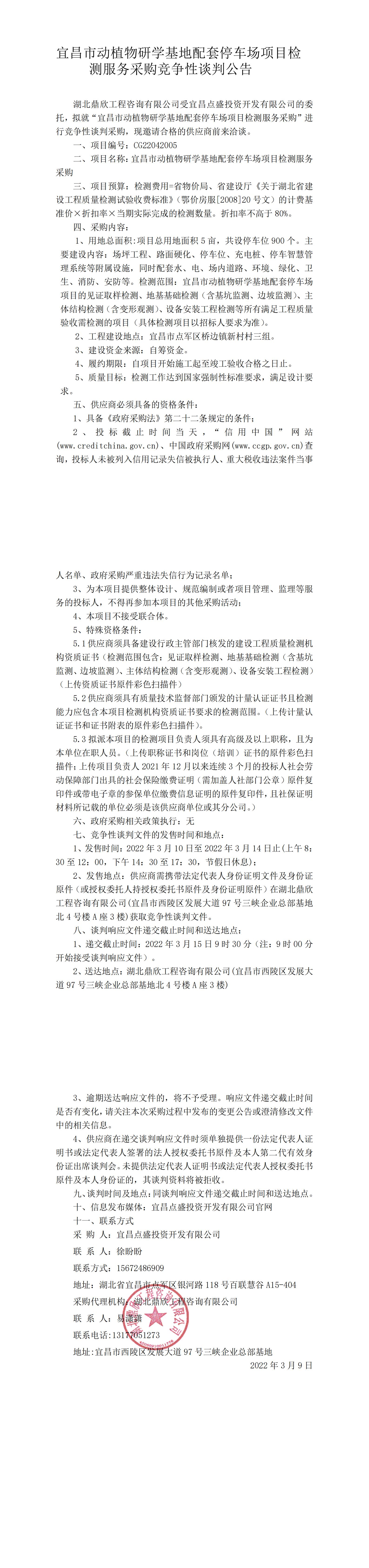 宜昌市動植物研學基地配套停車場項目檢測服務采購競爭性談判公告