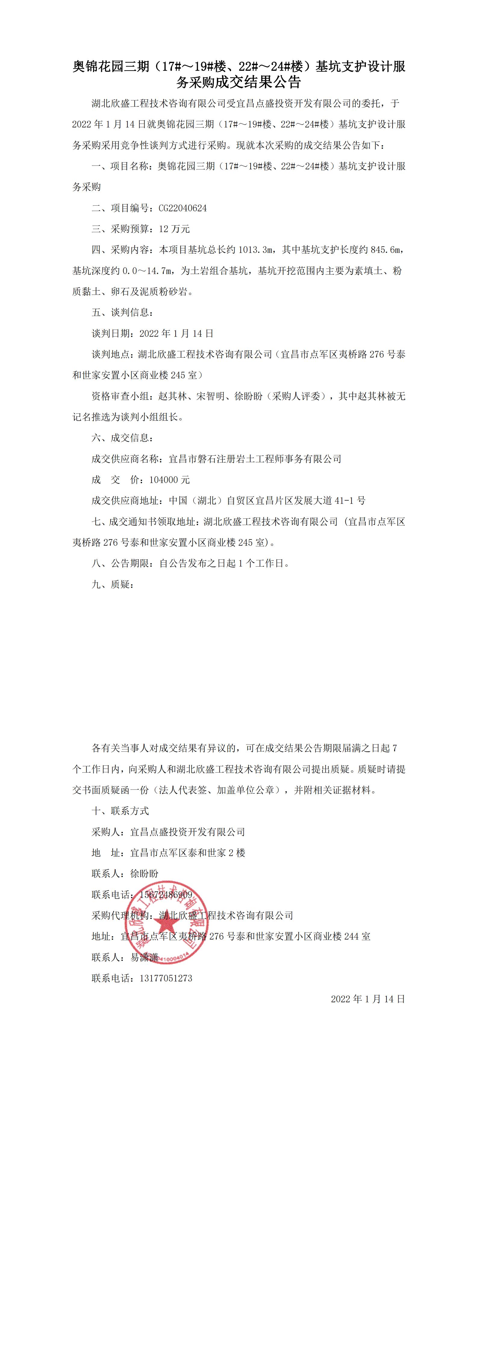 奧錦花園三期(17#~19#樓、22#~24#樓)基坑支護設計服務采購成交結(jié)果公告