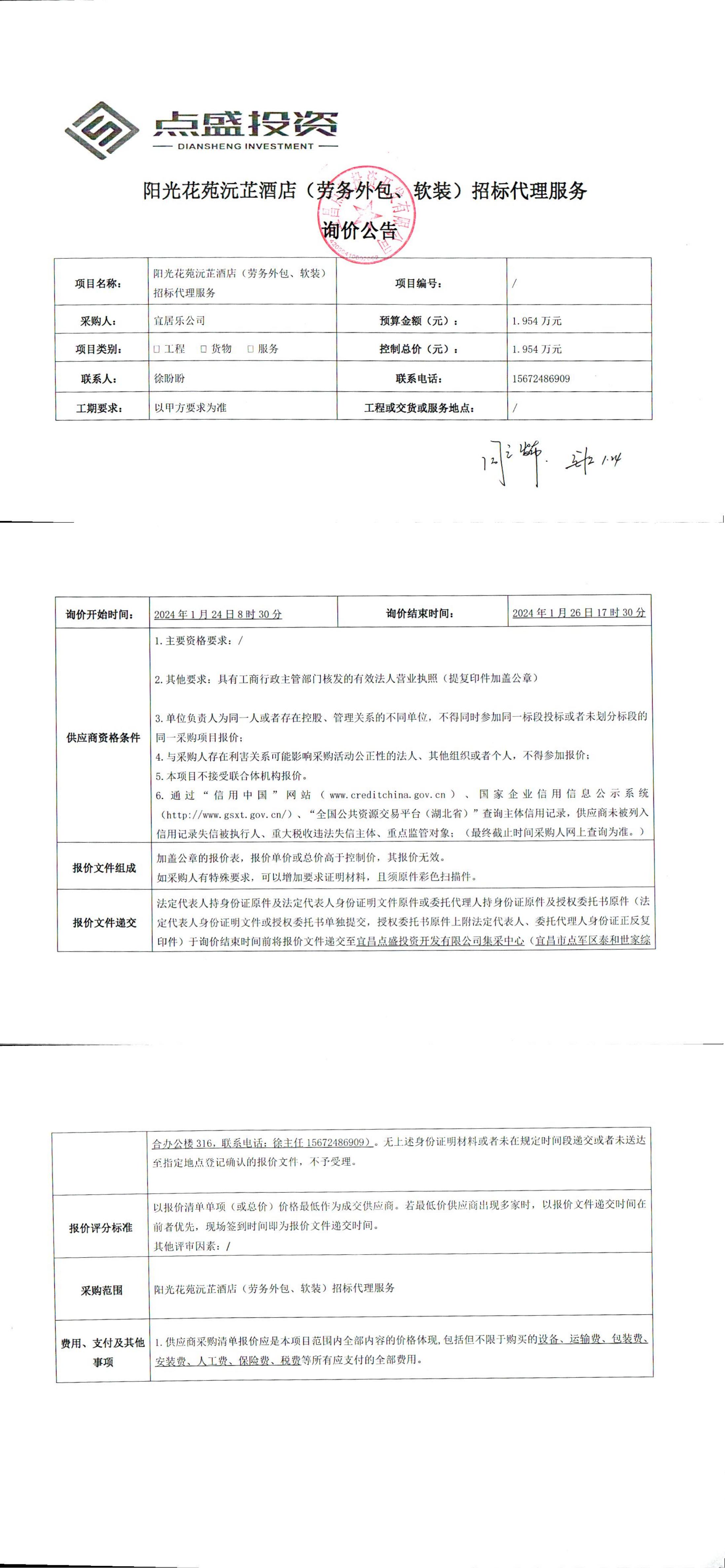 陽光花苑沅芷酒店(勞務(wù)外包、軟裝)招標(biāo)代理服務(wù)?詢價(jià)公告