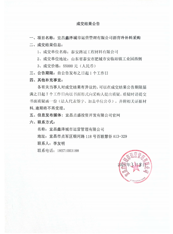 宜昌鑫澤城市運營管理有限公司瀝青冷補(bǔ)料采購項目成交公告