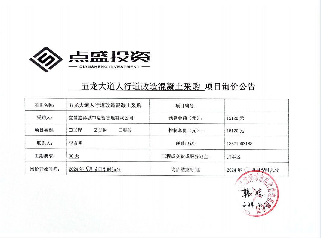 五龍大道人行道改造混凝土采購項(xiàng)目詢價(jià)公告