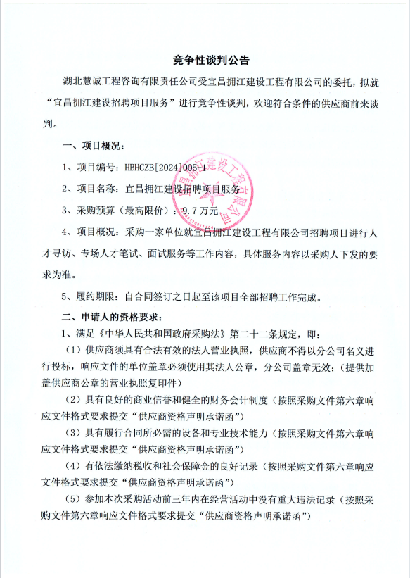 宜昌擁江建設招聘項目服務競爭性談判公告