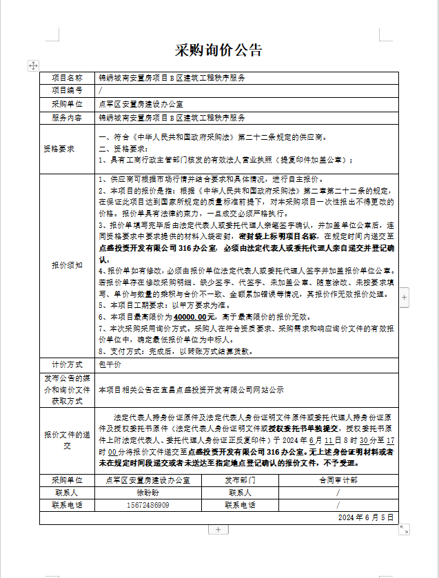 錦繡城南安置房項(xiàng)目B區(qū)建筑工程秩序服務(wù)詢價(jià)公告