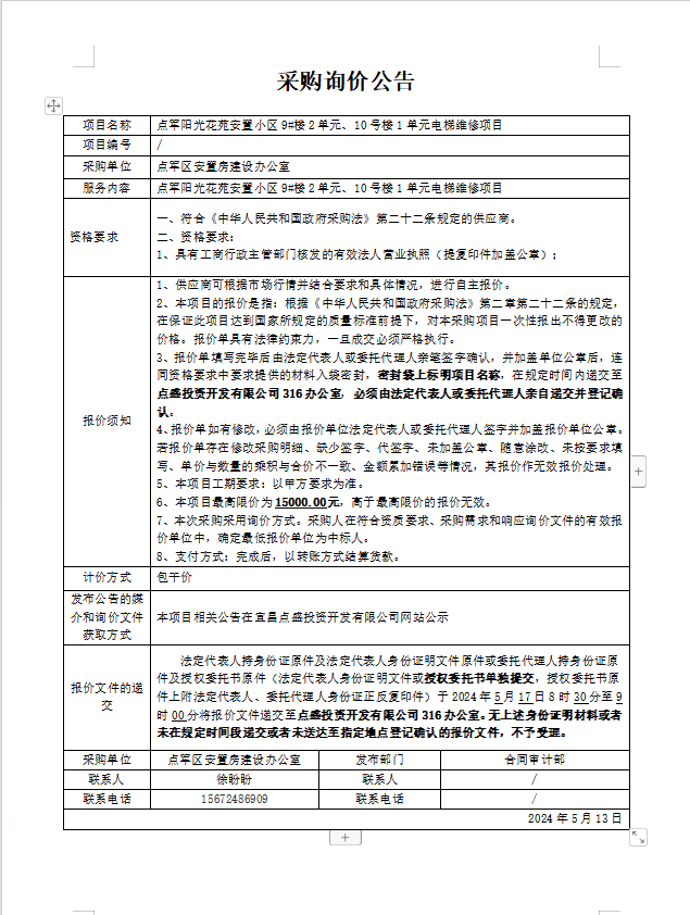 點(diǎn)軍陽光花苑安置小區(qū)9#樓2單元、10號樓1單元電梯維修項(xiàng)目詢價公告