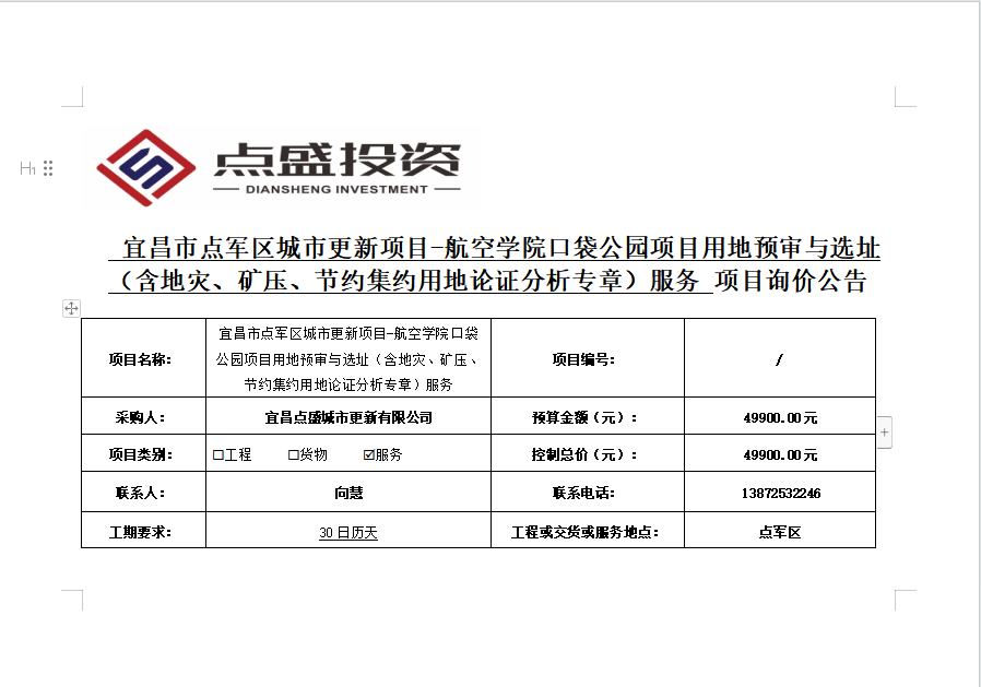宜昌市點軍區(qū)城市更新項目-航空學(xué)院口袋公園項目用地預(yù)審與選址(含地災(zāi)、礦壓、節(jié)約集約用地論證分析專章)服務(wù)詢價公告