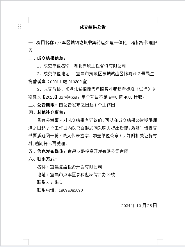 點軍區(qū)城鎮(zhèn)垃圾收集轉(zhuǎn)運處理一體化工程 招標代理服務成交公告