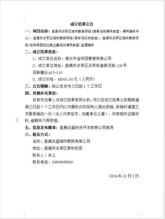 宜昌市點軍區(qū)城市更新項目(湖景名苑便民食堂、便民服務(wù)中心)、宜昌市點軍區(qū)城市更新項目(停車場及充電樁)、宜昌市點軍區(qū)城市更新項目(佳和家園創(chuàng)業(yè)就業(yè)基地及便民食堂)監(jiān)理服務(wù)成交公告