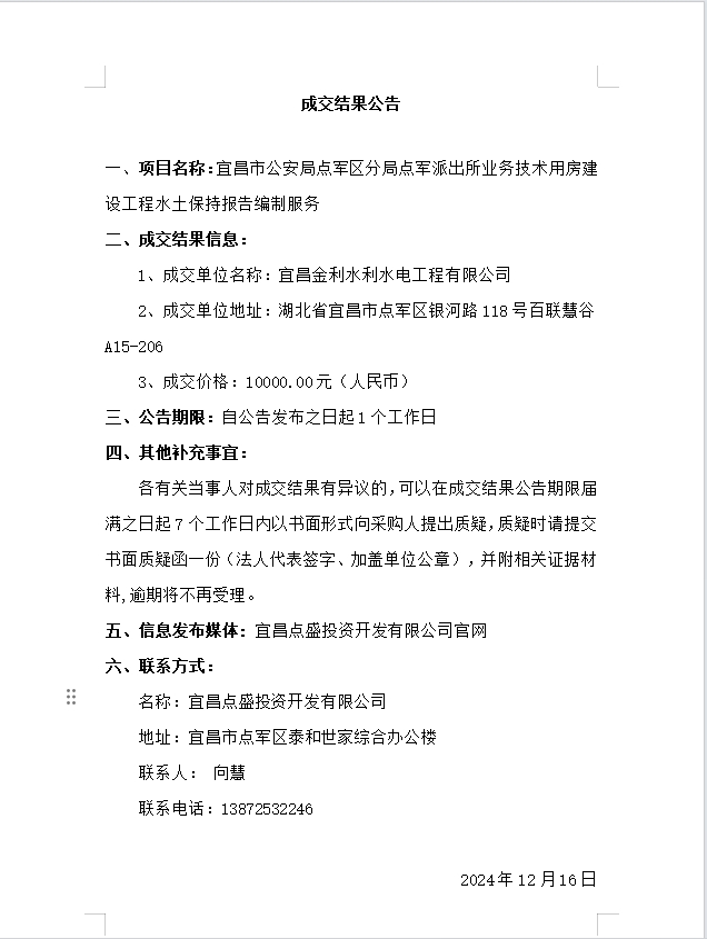 宜昌市公安局點軍區(qū)分局點軍派出所業(yè)務技術(shù)用房建設(shè)工程水土保持報告編制服務成交公告